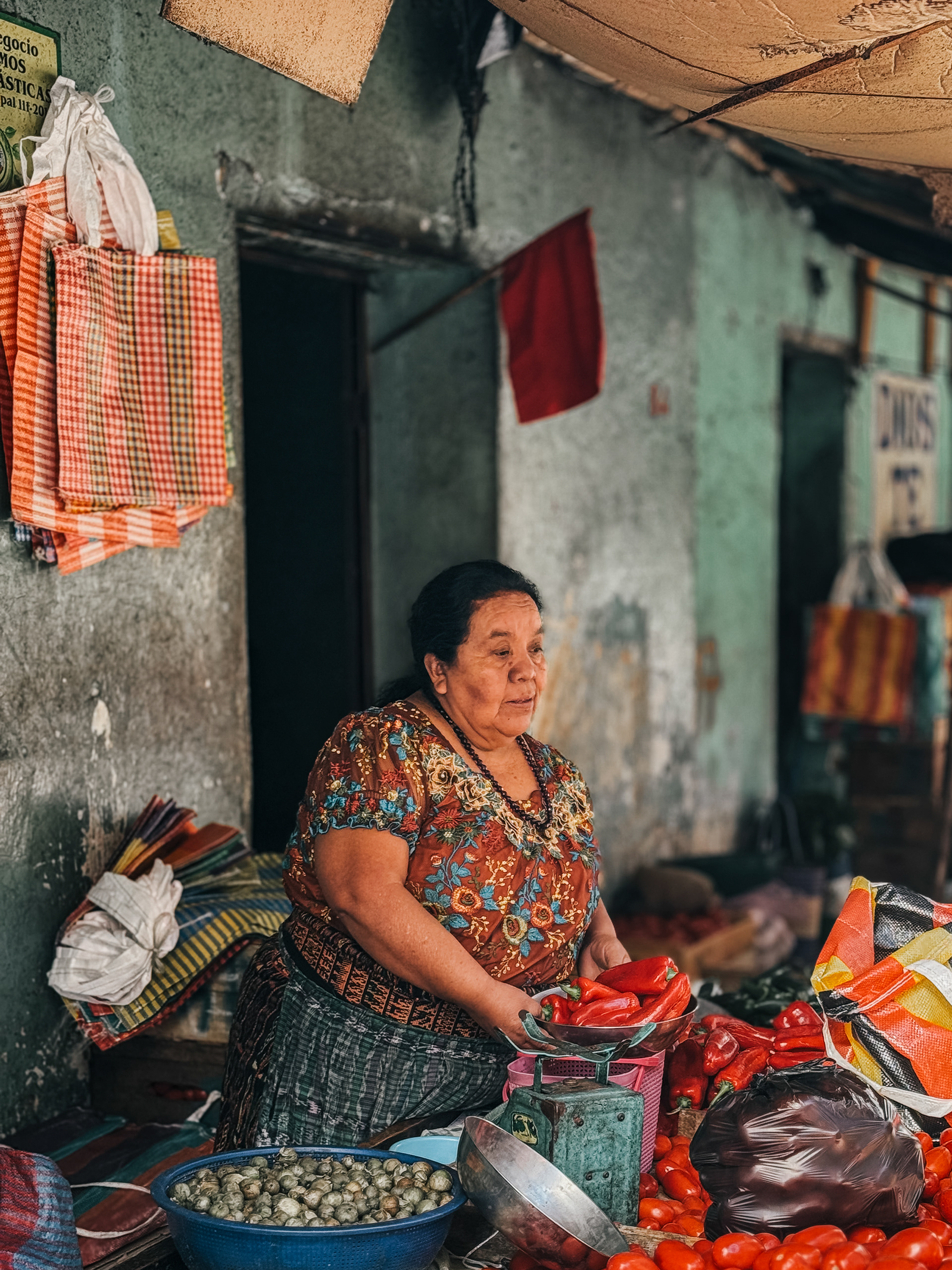 The scent of roasting corn and freshly made chuchitos curls from nearby stalls, blending with the sharp sweetness of tropical fruits stacked high in wooden crates. Women in embroidered huipils barter gently, their voices rising and falling like music. Children weave through the aisles, laughter bounces off the terracotta rooftops. Locals carts creak as they roll over cobblestones, footsteps tap and echo, and baskets shift and rustle under the weight of hands at work. Fingers brush the woven fibers, sending a soft swish through the textiles. Coins clink lightly as they change hands.