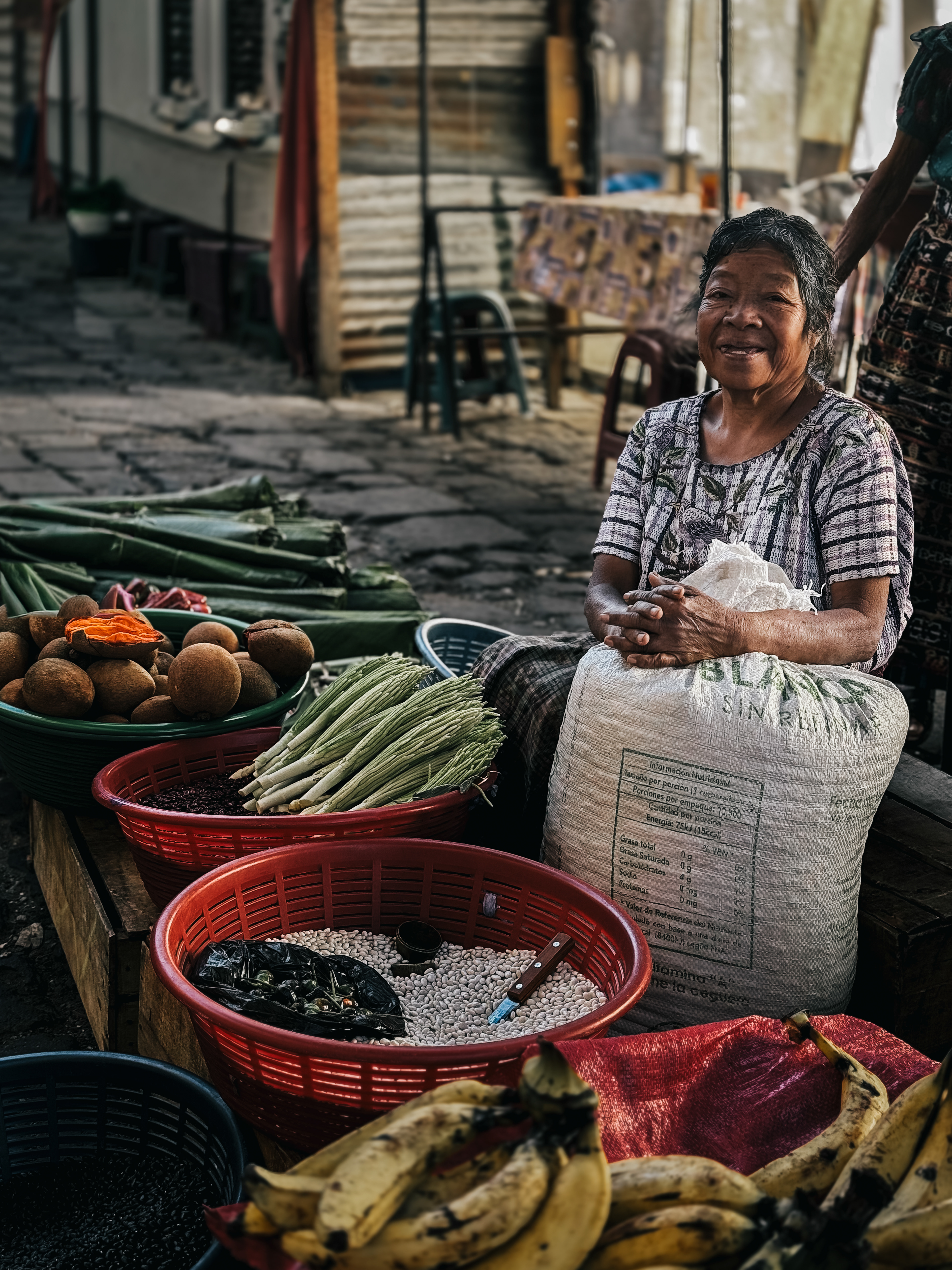 Nearby, a vendor lifts a chipped clay cup to his lips, sipping thick, aromatic Guatemalan coffee. The warmth trails through the morning air, mingling with the scent of deep rooted, local culture and the occasional rustle of woven baskets. Nothing feels rushed. Every gesture has its rhythm, every exchange its quiet grace.